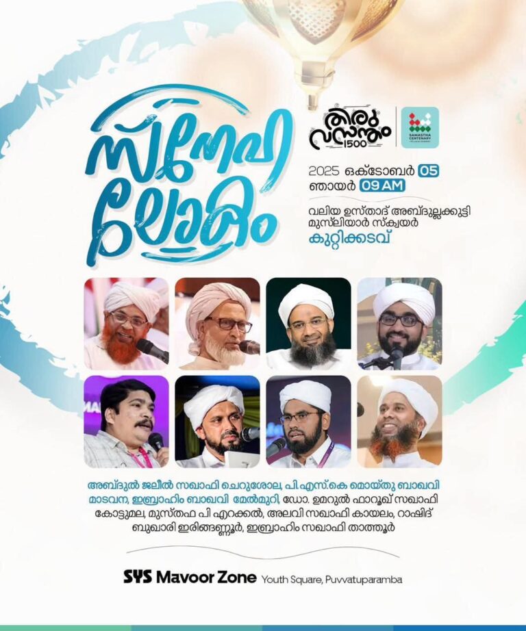 കുറ്റിക്കടവ് | എസ് വൈ എസ് മാവൂർ സോൺ ‘സ്നേഹലോകം’ ഇന്ന് രാവിലെ മുതൽ കുറ്റിക്കടവ് വലിയ ഉസ്താദ് അബ്ദുല്ലക്കുട്ടി മുസ്ലിയാർ സ്ക്വയറിൽ നടക്കും.