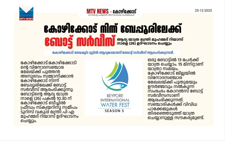 കോഴിക്കോട്:കോഴിക്കോടിൻ്റെ വിനോദസഞ്ചാര മേലയ്ക്ക് പുത്തൻ അനുഭവം സമ്മാനിക്കാൻ കോഴിക്കോട് നിന്ന് ബേപ്പൂരിലേക്ക് ബോട്ട് സർവീസ് ആരംഭിക്കുന്നു. ബോട്ടിൻ്റെ ആദ്യ യാത്ര നാളെ (26) പകൽ 10.30 ന് കോഴിക്കോട് ബീച്ചിൽ ഫ്രീഡം സ്ക്വയറിനു സമീപം ടൂറിസ് വകുപ്പ് മന്ത്രി പി എ മുഹമ്മദ് റിയാസ് ഉദ്ഘാടനം ചെയ്യും. കോഴിക്കോട്-ബേപ്പൂർ റൂട്ടിൽ ആദ്യമായാണ് ബോട്ട് സർവീസ് ആരംഭിക്കുന്നത്.