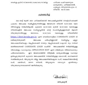 കെ-ടെറ്റ് ജൂൺ 2025 പരീക്ഷയ്ക്കായി അപേക്ഷിച്ചവരിൽ നോട്ടിഫിക്കേഷൻ പ്രകാരം അപേക്ഷ സമർപ്പിക്കുന്നതിനുള്ള അവസാന തീയതി 15/07/2025 വരെ ദീർഘിപ്പിച്ച് നൽകിയിട്ടുണ്ട്. കൂടാതെ 03/07/2025 മുതൽ 10/07/2025 വരെയുള്ള തീയതികളിൽ അപേക്ഷ സമർപ്പിച്ചതിൽ തെറ്റ് സംഭവിച്ചിട്ടുള്ളവർക്ക് ആയത് തിരുത്തുന്നതിനുള്ള അവസരം 15/07/2025 വരെയുള്ള തീയതിയിൽ https://ktet.kerala.gov.in ๑ ณัย CANDIDATE LOGIN ലഭിക്കുന്നതുമാണ്. അപേക്ഷ പരിപൂർണ്ണമായി സമർപ്പിച്ച എല്ലാ അപേക്ഷാർത്ഥികളും ആപ്ലിക്കേഷൻ നമ്പറും ആപ്ലിക്കേഷൻ ഐ.ഡി. യും നൽകി ഓൺലൈനായി CANDIDATE LOGIN ചെയ്ത് അപേക്ഷയിൽ നൽകിയിട്ടുള്ള വിവരങ്ങളും ഫോട്ടോയും APPLICATION EDIT എന്ന ലിങ്കിലൂടെ നിർബന്ധമായും പരിശോധിക്കണം. ഈ അവസരത്തിൽ നിർദ്ദിഷ്ട മാതൃകയിലുള്ള ഫോട്ടോ ഉൾപ്പെടുത്തുന്നത് കൂടാതെ അപേക്ഷയിൽ നൽകിയിട്ടുള്ള ലാംഗ്വേജ്, ഓപ്ഷണൽ സബ്ജക്ടുകൾ, വിദ്യാഭ്യാസ ജില്ല, അപേക്ഷാർത്ഥികളുടെ പേര്, രക്ഷകർത്താവിന്റെ പേര്, ജെൻഡർ, ஜற തീയതി, വിദ്യാഭ്യാസ യോഗ്യത എന്നിവയും തിരുത്താവുന്നതാണെന്ന് അറിയിക്കുന്നു.